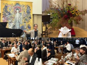納涼例会(2025/09/26)完成したばかりのみょうおんホールでの月見と言うことで、秋を感じられる生花がとても素敵でした。ジャズも透き通る歌声と共に心地良い雰囲気を感じながら皆が談笑している姿はとても良かったです。 |